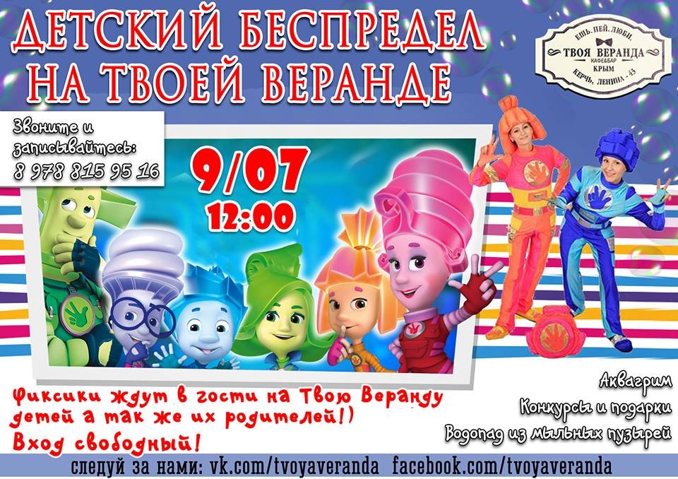 Дорогие наши маленькие гости и их родители! 09 июля Твоя Веранда приглашает на Детский беспредел, где Вас будут встречать Фиксики. В программе: водопад мыльных пузырей, аква гримм, конкурсы и конечно же подарки. Дружная атмосфера и море позитива, лучшее времяпровождение для ваших детей. Начало в 12-00. Вход абсолютно свободный.