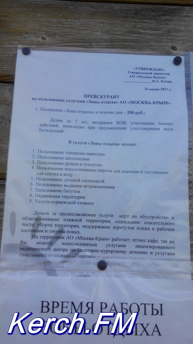 В редакцию Керчь.ФМ написала постоянная читательница, с которой требовали 200 рублей за вход на пляж на территории пансионата «Москва». В подтверждение своих слов она прислала фотографию прейскуранта.