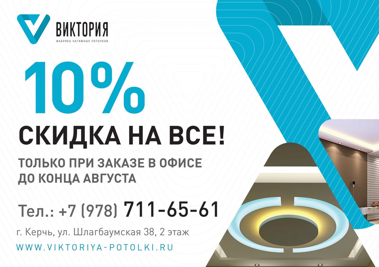 1 августа мы открыли выставочный зал натяжных потолков! В честь этого мы дарим всем скидку 10% на весь товар при заказе в офисе по адресу Шлагбаумская, 38, 2 этаж. Скидка действует только до конца августа.