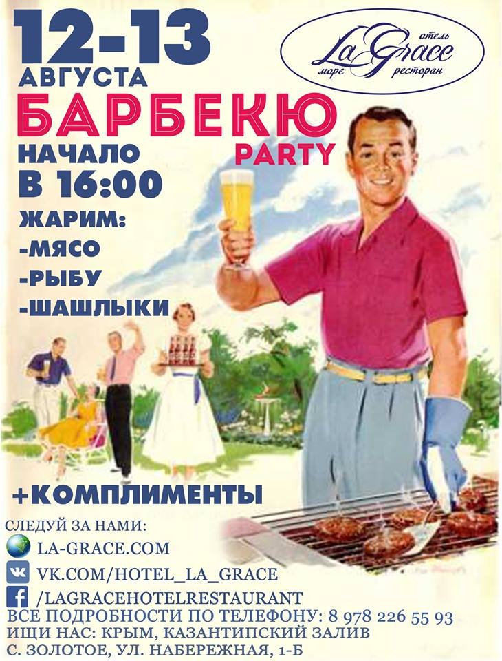 Скажи душному городу нет, приветливому освежающему морю да! Отель LaGrace ждет Вас в эти выходные на Гриль Party. Жарим без перерыва. Сочное мясо прямо с гриля, а с ним бокал холодного пенного. Или рыбу с бокальчиком белого… Ууух!! Ну, что может быть лучше? Заряжаем позитивом и дарим комплименты)