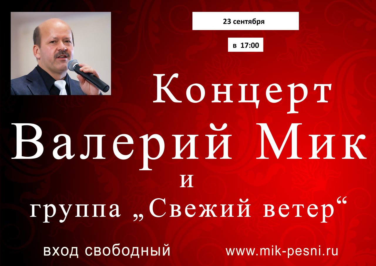 Валерий Мик и группа «Свежий ветер» дадут концерт 23 сентября в Городском центре культуры им. Богатикова. Участники группы приехали к нам из различных городов Краснодарского края (Туапсе, Пятигорск, Геленджик, Краснодар, Минеральные Воды). Будут исполнены красивые песни, которые заставят задуматься над смыслом жизни.
