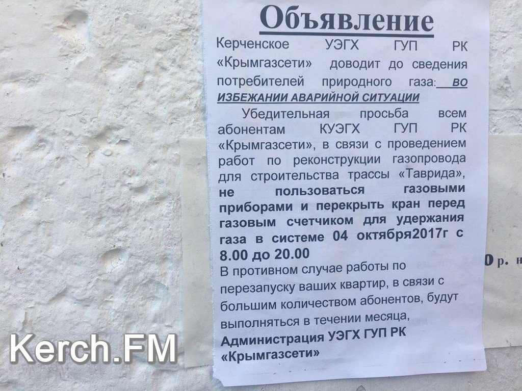 В Керчи, 30 сентября на подъездах по улице Ворошилова и Буденного, сотрудники Керченского УЭГХ ГУП РК «Крымгазсети» расклеили объявления с просьбой, чтобы абоненты не пользовались газовыми приборами 4 октября. Об этом Керчь.ФМ сообщили постоянные читатели