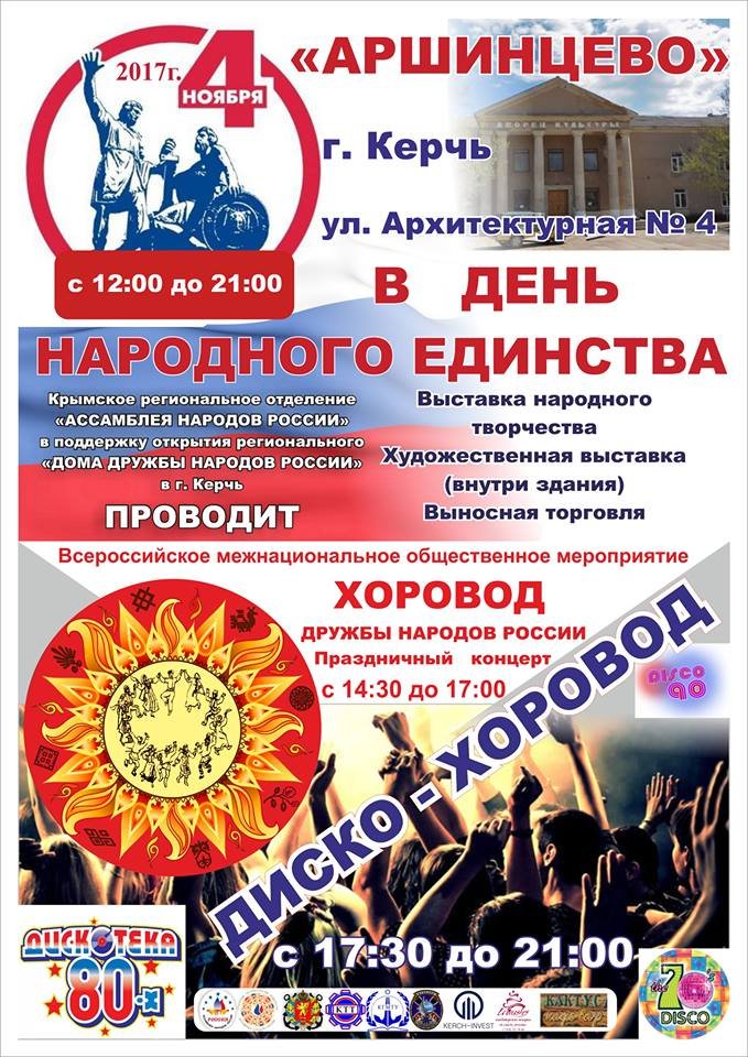 В Керчи 4 ноября, в честь Дня народного единства в Аршинцево пройдут праздничные мероприятия. Гостей ждет выставка народного творчества, выставка картин, праздничный концерт, а также «Хоровод Дружбы народов России», - передает Керчь.ФМ.