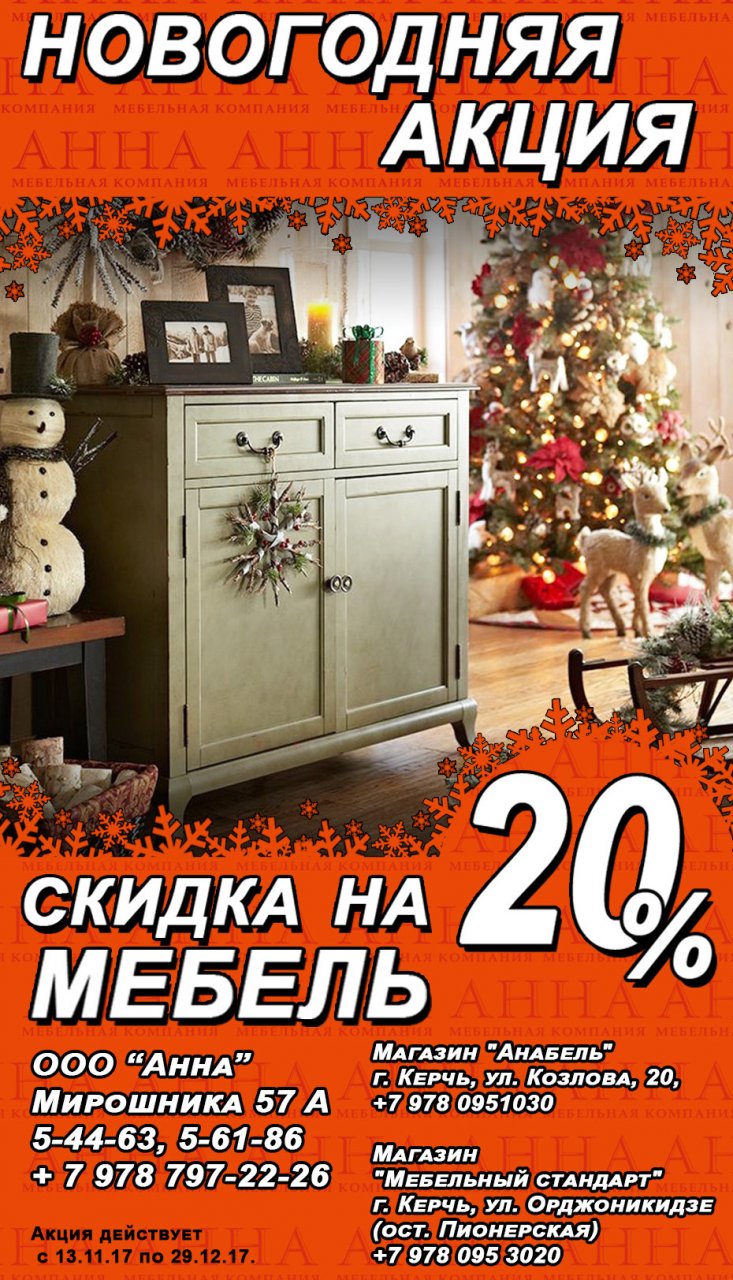 Мебельная фирма «АннА» объявляет о скидках (с 13.11.17 по 29.12.17)!