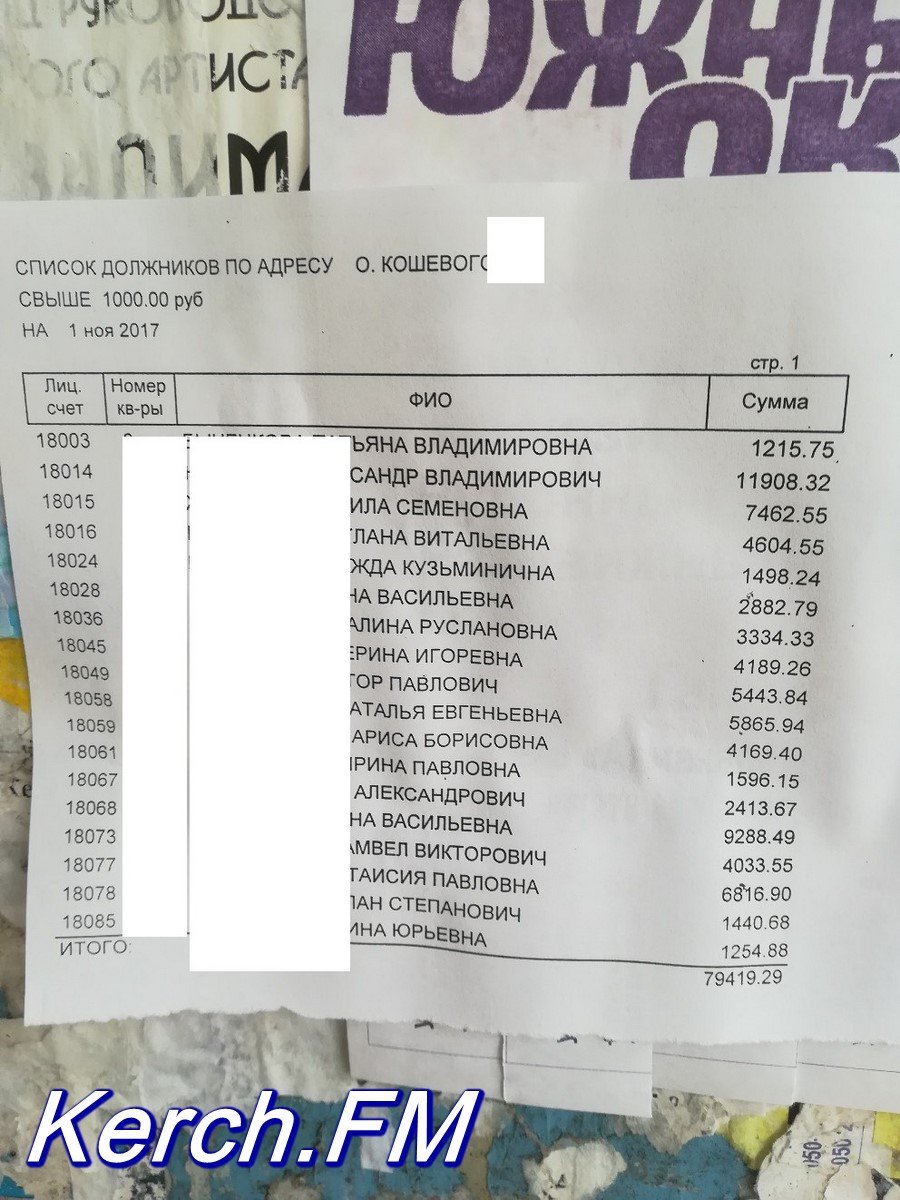 В Керчи на многоквартирные дома по ул. Олега Кошевого вывесили списки должников за коммунальные услуги. В списке указан не только счет абонента и долг на 1 ноября, но и фамилия, имя, отчество. Кроме того, стоит и номер квартиры, - передает Керчь.ФМ.