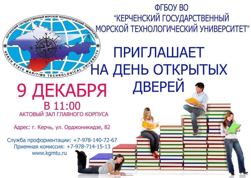 9 декабря в 11:00 состоится День открытых дверей в ФГБОУ ВО «Керченский государственный морской технологический университет». Мероприятие пройдет в актовом зале главного корпуса по адресу: ул. Орджоникидзе, 82.