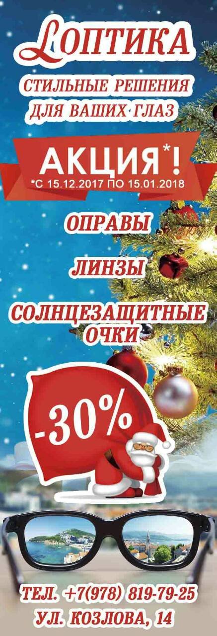 Салон-магазин «L оптика» поздравляет Всех с Наступающим Новым Годом и Рождеством Христовым! В преддверие праздников, наш салон проводит АКЦИЮ - СКИДКИ до 30% на оправы, линзы, солнцезащитные очки.