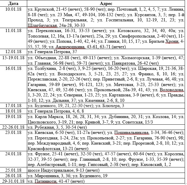 В связи с плановым ремонтом электрооборудования в январе 2018 г. в период с 8 до 17 часов будут происходить отключения линий электропередачи согласно нижеприведенному графику. Об этом сообщает ГУП РК «Крымэнерго», - передает Керчь.ФМ.