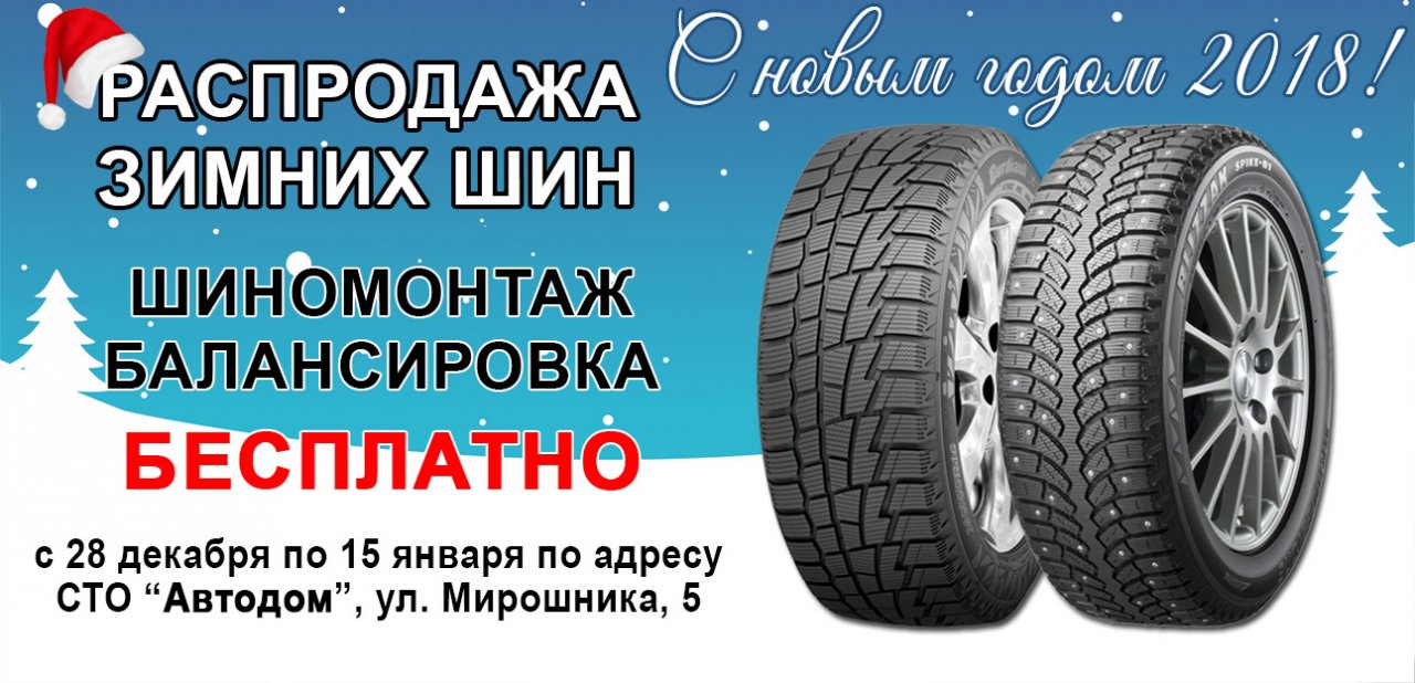 СТО Автодом по улице Мирошника, 5 поздравляет Вас с новым 2018 годом и приглашает на распродажу зимних шин с 28 декабря по 15 января. При покупке комплекта шин шиномонтаж бесплатно!