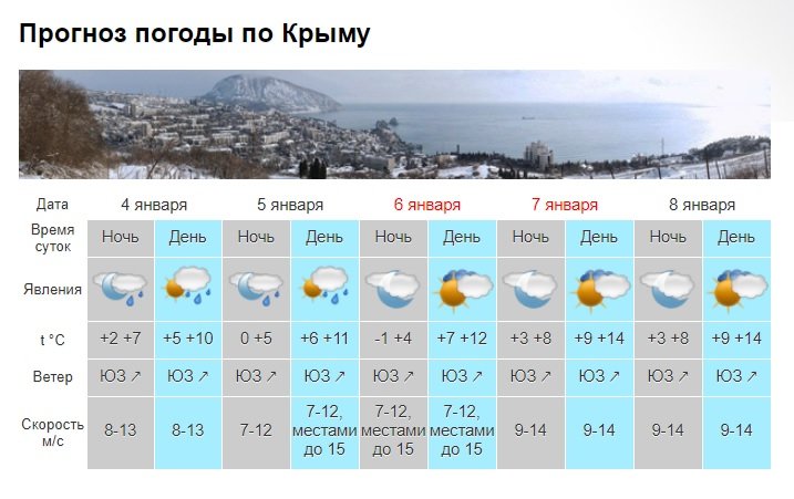 5 января: Переменная облачность. Без осадков. Ветер северный 6-11 м/с. Температура воздуха ночью +4…+6°, днем +8…+10°.