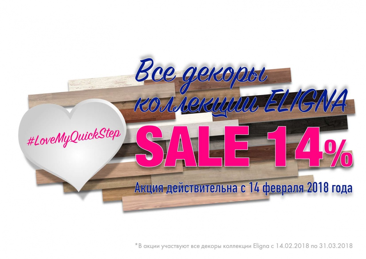 Уважаемые жители и гости города, представляем Вашему вниманию акцию от торговой марки «Quick Step» (Бельгия) на ламинат коллекции Eligna 8 mm 32 кл. со скидкой 14%!