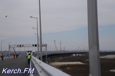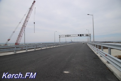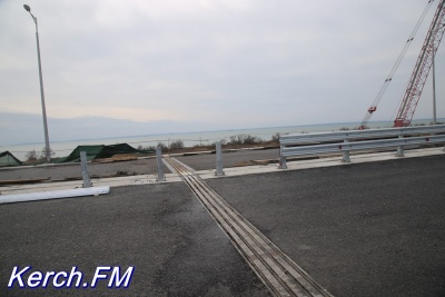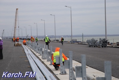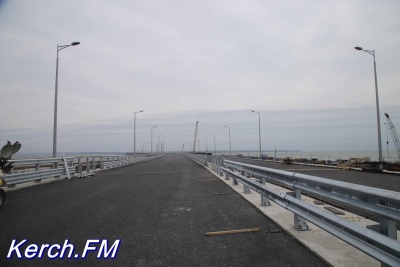 Автодорожная часть Крымского моста уже построена - забиты все сваи, готовы пролеты. Остались работы по устройству дорожного полотна, большая часть уже заасфальтирована в два слоя. На участках с асфальтом устанавливают барьерное ограждение, мачтовое освещение и информационные табло, оборудуют ливневки.