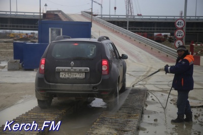 Всем автомобилям, которые заезжают на Крымский мост, моют колеса, чтоб не пачкать новый асфальт до открытия