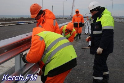 Он отметил, что автодорога на мосту заасфальтирована на 70%. Всего заасфальтировано 14 из 19 км. Параллельно укладке асфальта ведётся обустройство барьерного ограждения, которое уже выполнено на 60%. Смонтировано 70% элементов искусственного освещения.
