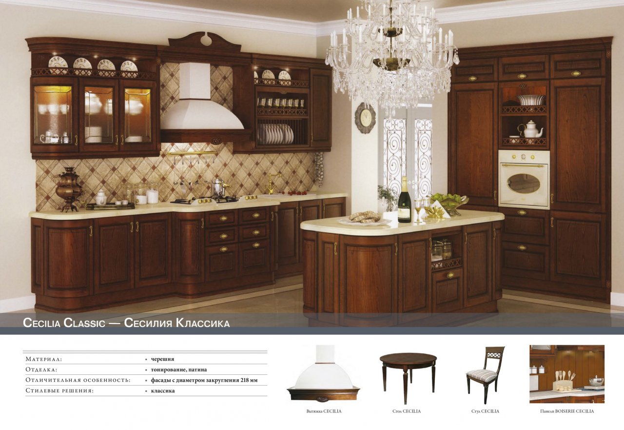 Модель Cecilia (Сесилия) - Эта кухня предназначена для настоящих ценителей классики. Для фасада использовали черешню с эффектной патиной по рельефу. Теплый цвет дерева и оригинальные витражи, представляющие орнаментальную композицию из цветных стекол, включающих стекла с перламутром, добавляют изящности и смягчают строгость прямых линий фасадов. Столешница из искусственного акрилового камня/пластик. Корпус ЛДСП/столярная плита/ фанера/ МДФ, отделка шпон ценных пород дерева/пластик/эмаль/шпон. Механизмы трансформации Blum/Hettich/Hafele. Для модели разработаны декоративные стекла, вытяжка и столовая группа.