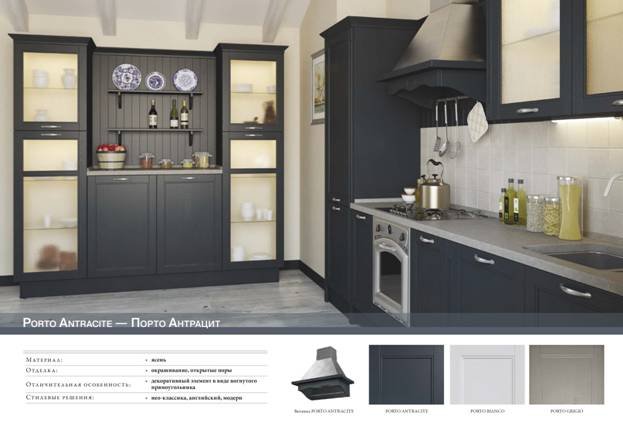 Модель Porto (Порто) -яркий пример неоклассического стиля: строгие линии, лаконичный дизайн, полностью соответствующий последним европейским тенденциям. Фасады и декоративные элементы модели выполнены из массива ясеня в четырех наиболее востребованных цветовых решениях: Бьянко, Гриджио, Антрацит, Крем. Столешница из искусственного акрилового камня/пластик. Корпус ЛДСП/столярная плита/ фанера/ МДФ, отделка шпон ценных пород дерева/пластик/эмаль/шпон. Механизмы трансформации Blum/Hettich/Hafele. Для модели разработаны декоративные стекла, вытяжка и столовая группа.