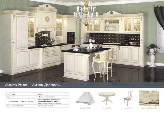 Augusto (Аугусто) - Фасады и декоративные элементы модели выполнены из массива ясеня. Ярко выраженные традиции классического стиля, актуального во все времена, воплотились в модели Augusto (Аугусто). Выпаленная в помпезном «дворцовом» стиле, теплая и светящаяся, она одинаково великолепно будет выглядеть и в кухне городской квартиры, и в столовой загородного дома. Столешница из искусственного акрилового камня/пластик. Корпус ЛДСП/столярная плита/ фанера/ МДФ, отделка шпон ценных пород дерева/пластик/эмаль/шпон. Механизмы трансформации Blum/Hettich/Hafele. Для модели разработаны декоративные стекла, вытяжка и столовая группа.