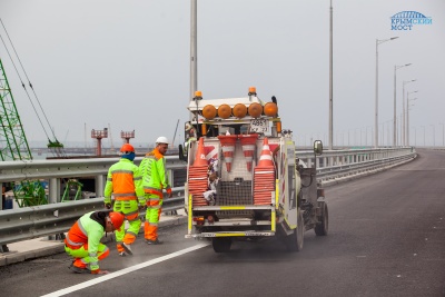 На автодорожной части моста через Керченский пролив началось нанесение дорожной разметки. Это один из финальных этапов работ по обустройству дорожного полотна, который стартовал со стороны таманского берега. Об этом сообщает инфоцентр «Крымский мост», - передает Керчь.ФМ