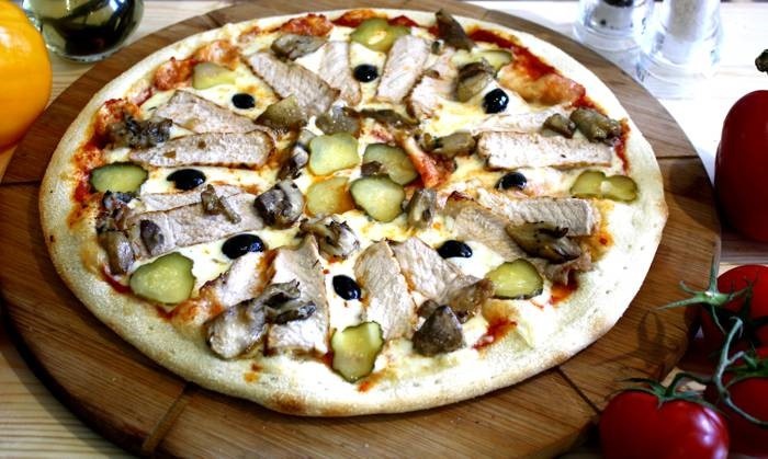 Для ее приготовления мы используем классическое итальянское тесто, соус из перетёртых помидор, сыр моцарелла, примаринованную свинину/куриное филе, обжаренную на гриле, маринованные огурчики, обжаренные грибочки, чёрные маслины и наше отличное настроение :-)