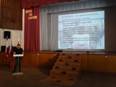 Оперуполномоченный по особо важным делам центра по противодействию экстремизму МВД по Республике Крым Анатолий Шуклин разъяснил учащимся цели и мотивы склонения молодежи к участию в деятельности запрещенных организаций, ознакомил с административной и уголовной ответственностью за деяния террористической и экстремистской направленности.
