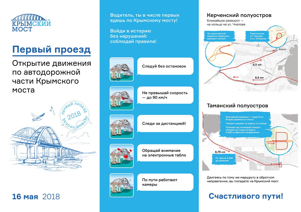 Въезд на автоподходы к Крымскому мосту со стороны Таманского и Керченского полуостровов будет открыт за час до запуска движения по мосту - в 4:30 утра 16 мая. Чтобы проехать к мосту со стороны Краснодарского края, необходимо двигаться по федеральной трассе А-290 до развязки с новой дорогой на Таманском полуострове. Далее 40 км по автоподходу к Крымскому мосту. Со стороны Республики Крым движение начинается от развязки на существующей трассе «Симферополь - Керчь» и далее 8, 6 км до Крымского моста.