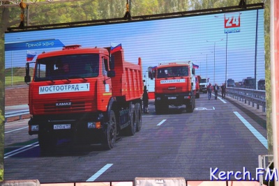 В Керчи 15 мая на площади Ленина на специальном экране показали прямое включение с торжественной части открытия Крымского моста. Президенту России Владимиру Путину показали диспетчерский пункт, а затем подвели к мостоотрядам, - передает Керчь.ФМ.