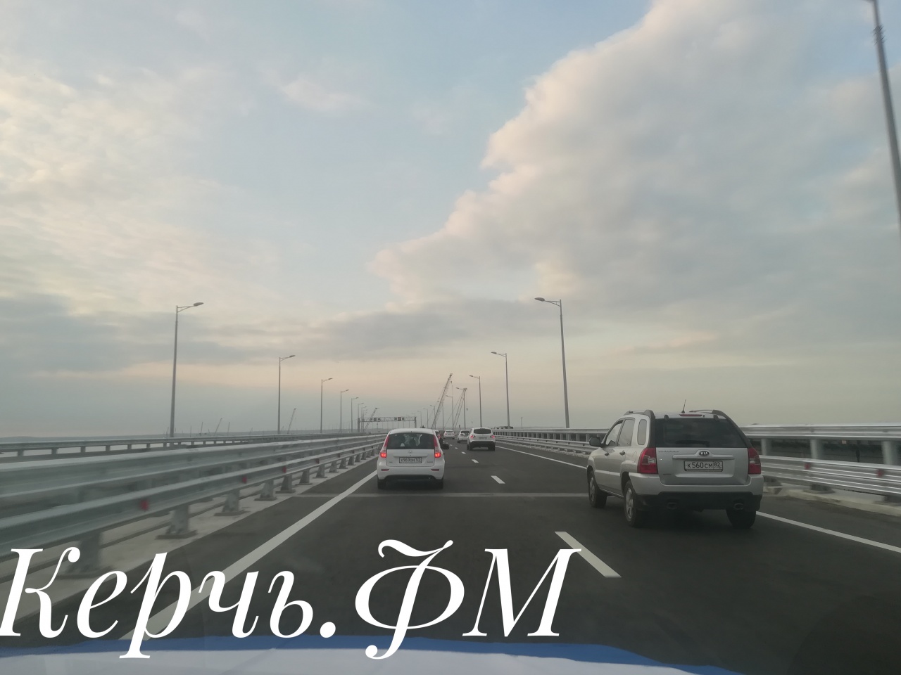 Колонна автомобилей 16 мая около 5.40 поехала по Крымскому мосту. За автомобилями едут байкеры. Сотни машин и мотоциклов едут по мосту в сторону Керчи
