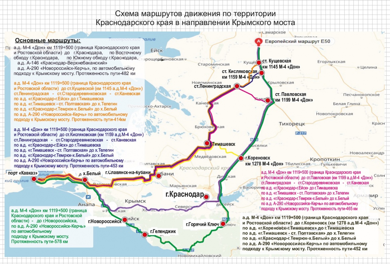 Редакция Керчь.ФМ в преддверии курортного сезона решила опубликовать схему маршрутов движения по территории Краснодарского края в направлении Крымского моста. На схеме указаны три дороги, по которым можно будет проехать к автоподходам и, соответственно, к Крымскому мосту.
