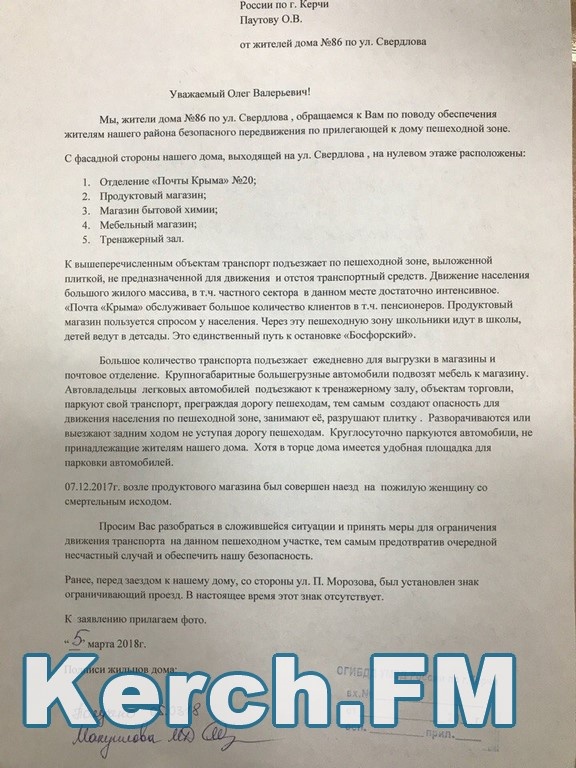 «В начале марта мы написали коллективное письмо начальнику ГИБДД УМВД по г. Керчи с просьбой принять меры по ограничению движения транспорта на пешеходном участке с фасадной стороны нашего дома. Большое количество крупногабаритного транспорта ежедневно подъезжает для выгрузки и погрузки в магазины и почтовое отделение. Автовладельцы легковых автомобилей подъезжает к тренажерному залу, объектам торговли, паркуют свой транспорт, преграждая дорогу пешеходам, тем самым создают опасность для движения населения по пешеходной зоне, занимают её, разрушают плитку. Легковой транспорт паркуют, минуя удобную площадку для парковки в торце дома, преграждая дорогу пешеходам, едут задом или разворачиваются, тем самым создают опасность для передвижения населения по пешеходной зоне, по которой передвигаются школьники, дети в детсады, пенсионеры на почту и магазины-это единственный путь к остановке Босфорский. Круглосуточно паркуются автомобили, не принадлежащие жителям нашего дома.