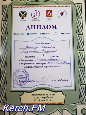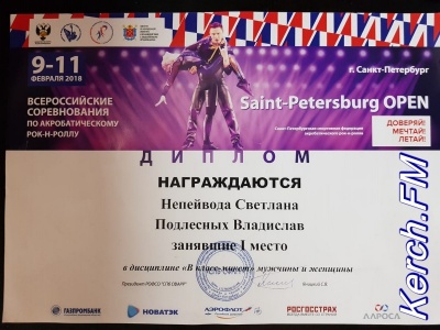 Спортсмен из Керчи - Подлесных Владислав в паре с Непейвода Светланой, спортсменом и тренером из Краснодара, на Всероссийских соревнованиях по акробатическому рок-н-роллу, состоявшихся в Подмосковье 13 мая, выиграли первенство и заняли 1-е место в дисциплине «В класс-микст. Мужчины и женщины». Об этом сайту Керчь.Фм сообщили участники соревнований.