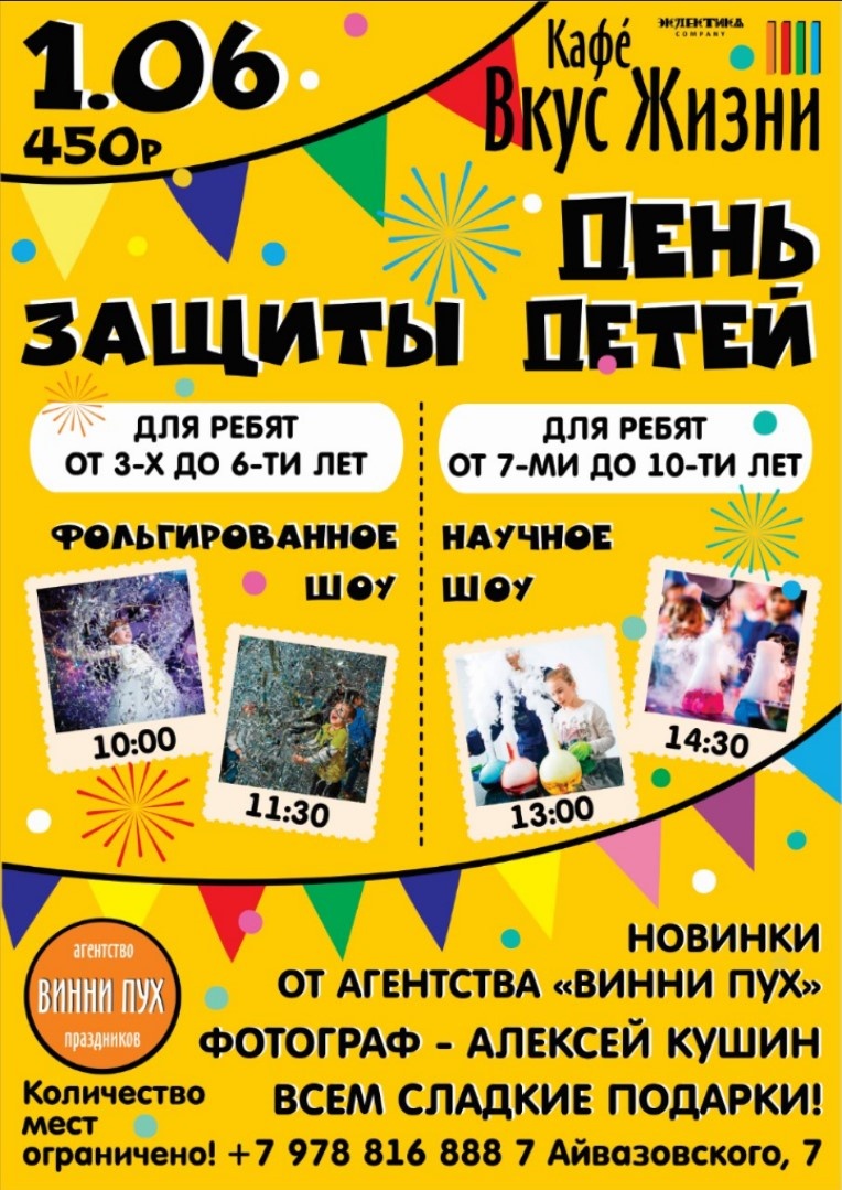 Совместно с агентством "Винни Пух" кафе "Вкус Жизни" приглашает ребят незабываемо провести 1-ое июня!