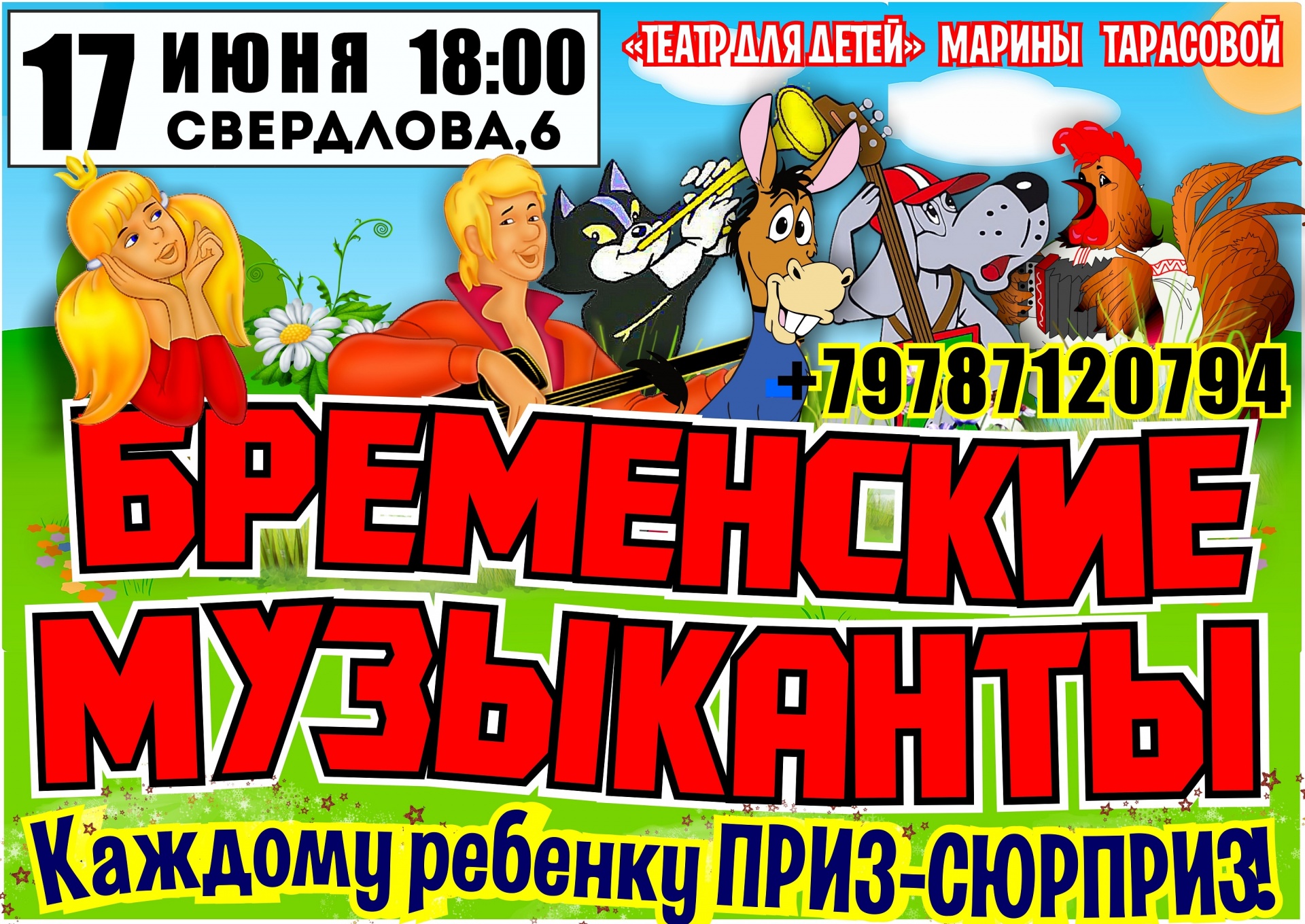 «Бременские музыканты» -спектакль-сказка для детей и взрослых. Продажа билетов: ул. Ленина (напротив Крымтелекома) - 10:00 - 17:00 +7978 71 20 794