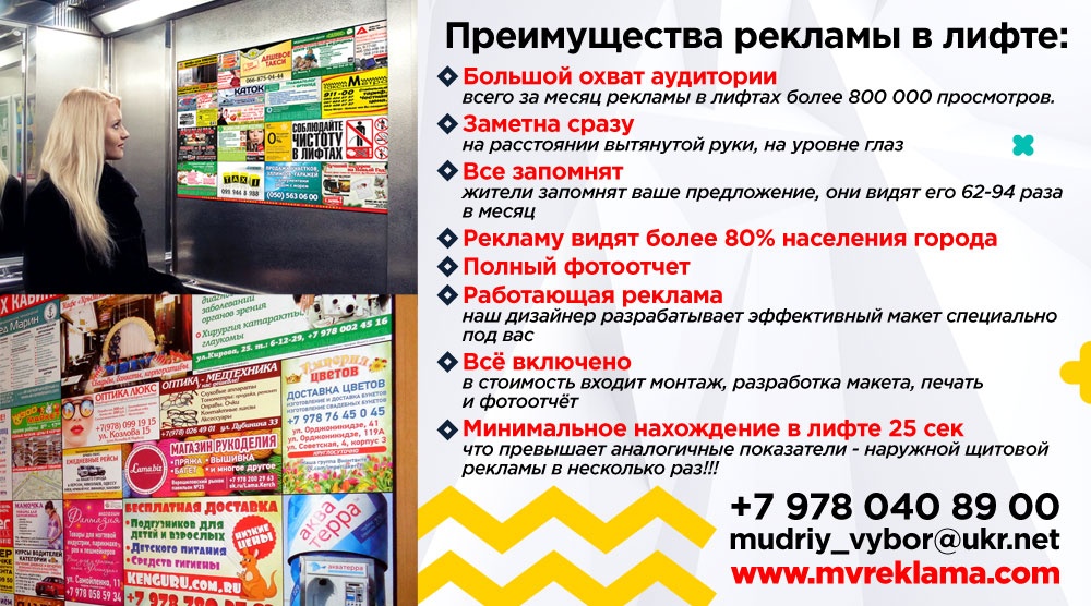 Реклама в лифтах лучший инструмент для информирования о проводимых акциях и при этом имеющий очень привлекательную стоимость и возможность оперативного донесения информации до жителей всех ближайших домов к объекту.