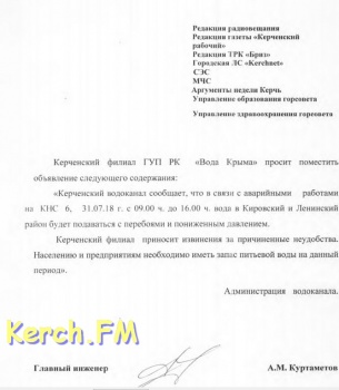 Завтра доброй половине керчан нужно будет запастись баклажками с водой. Керченский водоканал с 9 до 16 планирует проводить аварийные работы на КНС 6. Об этом сообщает пресс-служба водоканала, - передает Керчь.ФМ.