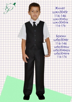 Для мальчиков - пиджаки, жилеты, брюки, сорочки белого и голубого цветов, галстуки.