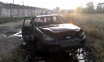 Водитель автомобиля «Лада Приора» не справился с управлением и допустил съезд транспортного средства в кювет, где столкнулся с огромным валуном, в результате чего автомобиль загорелся.
