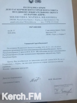 Она рассказала Керчь.ФМ, что еще в мае к ней обратились жители данного района и рассказали, что на придомовой территории домов по Ульяновых, 56 и 58, между тротуаром и дорогой, стоит большое сухое дерево, высотой около 12 метров. По словам жильцов, оно представляет опасность для жизни и здоровья пешеходов. 30 мая депутат написала обращение по данному поводу главе администрации Керчи Сергею Бороздину.
