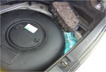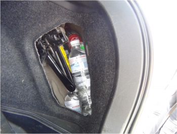 В ходе осмотра иномарки с применением специальных технических средств в багажном отделении под обшивкой и в нише для запасного колеса обнаружены емкости, предположительно содержащие алкогольную продукцию. Всего из технологических полостей извлечено более десятка пластиковых бутылей различного объема, вмещающих 14 литров спиртосодержащих жидкостей.