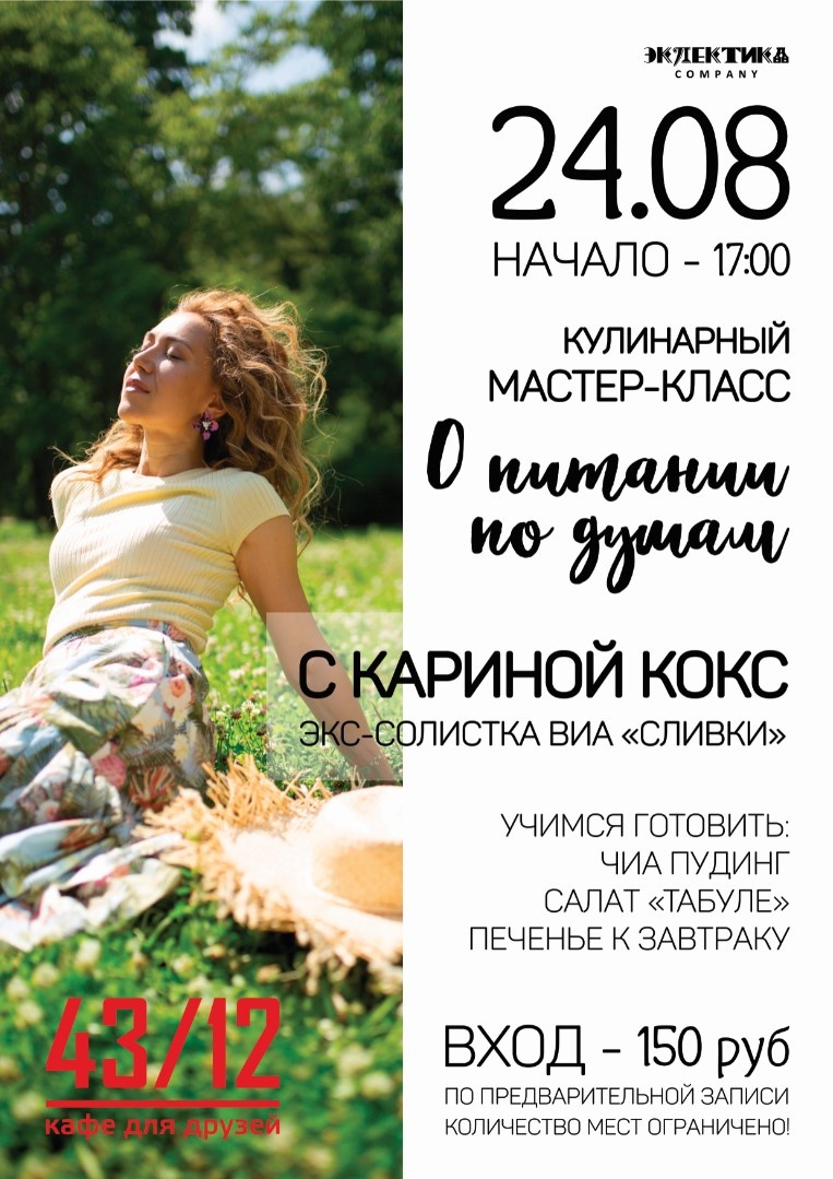 Впервые в Керчи 24-го августа, уже в эту пятницу в кафе 43/12 с авторским мастер-классом специальный гость: КАРИНА КОКС (экс-солистка ВИА "Сливки", создатель бренда экологической одежды для детей «Комета Ка», онлайн курса «Простой Детокс», постоянный участник выставок продуктов, услуг и товаров для здорового образа жизни, член жюри премии «LIVE ORGANIC AWARDS»).