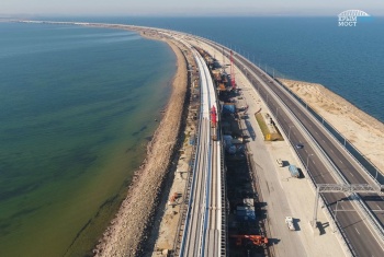 На другом берегу, со стороны Крыма, ведется строительство двухпутного железнодорожного подхода к мосту длиной 18 км. Одновременно по всей длине трассы выполняется комплекс запланированных работ - от переустройства коммуникаций и линий связи, строительства искусственных сооружений до устройства земляного полотна и насыпи под будущую дорогу. На объект начали поступать первые партии шпал. На готовых участках земляного полотна ведется подготовка к раскладке шпал для последующих работ по формированию верхнего строения пути.