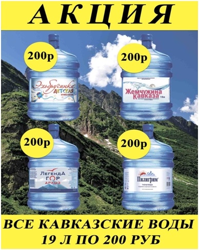 С 29.10.2018 по 3.11.2018 года природная питьевая вода из Кавказских источников 19 л. торговых марок «Жемчужина Кавказа», «Эльбрусинка детская», «Пилигрим» и новинка «Легенда гор Архыз» всего по 200 руб.