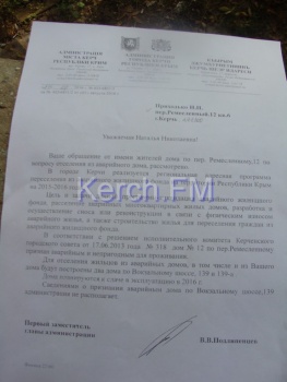 Дом в переулке Ремесленный, 12 внесли в адресную программу «Переселение граждан из аварийного жилого фонда на 2014-2015г». Власти обещают их переселить уже на протяжении четырех лет, однако им так и приходится жить в помещении с дырами и надеяться, что оно не рухнет, - передает Керчь.ФМ.