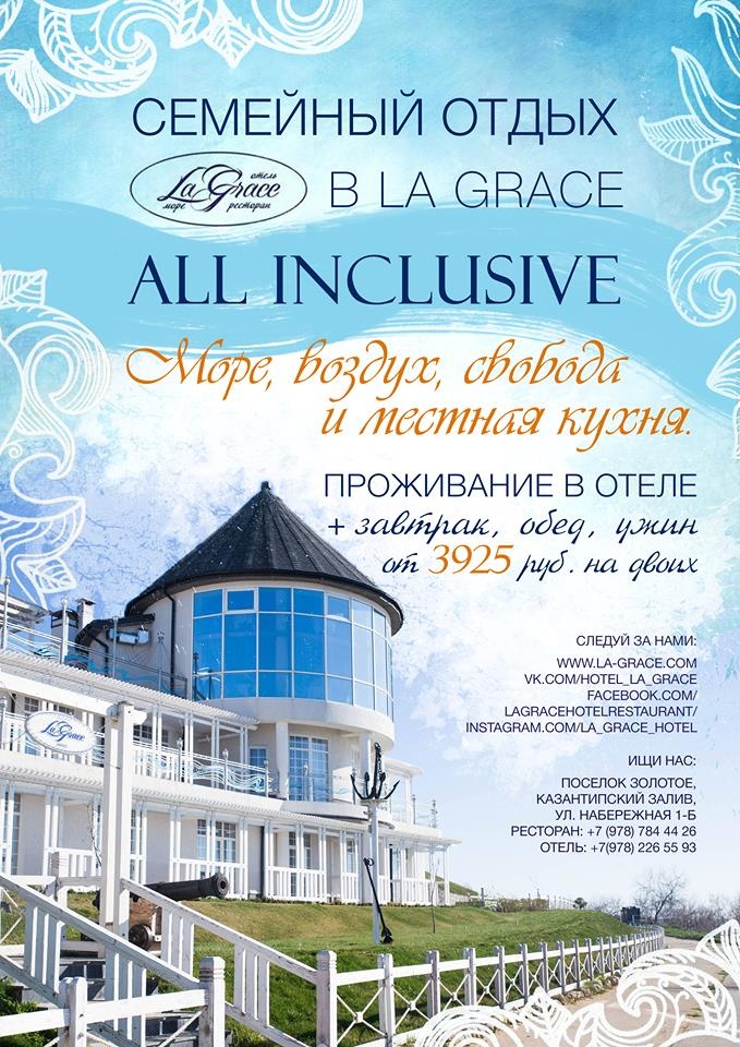 С 1 ноября в La Grace, не пропусти свой семейный отдых на море по системе all inclusive: проживание в отеле + завтрак, обед и ужин от 3 925 руб. на двоих!