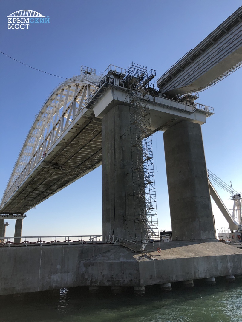 Железнодорожную арку Крымского моста соединили с пролетом транспортного перехода со стороны Керчи. Об этом сообщество «Крымский мост» сообщило в соцсетях.