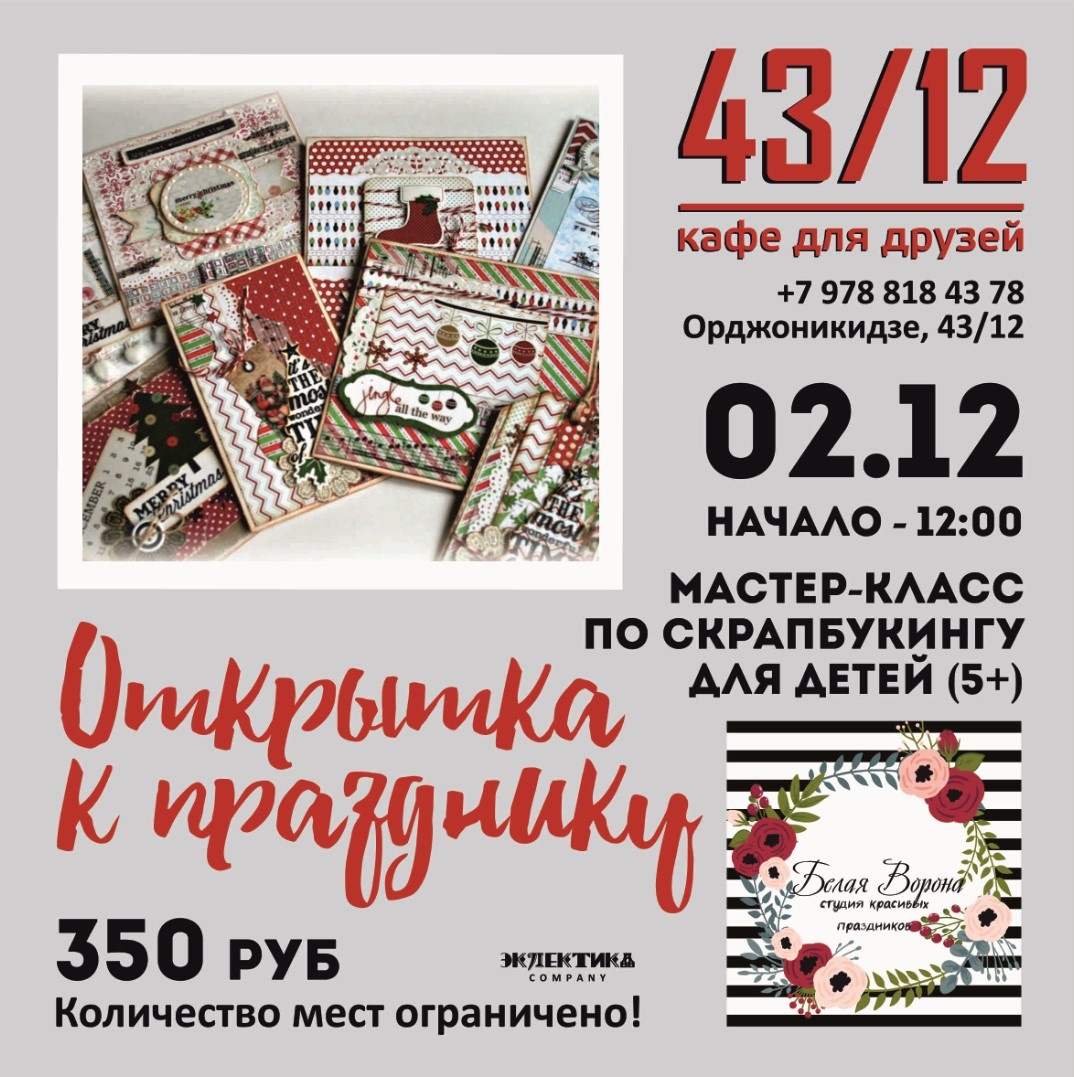 В первое воскресенье зимы, 02.12 в 12:00 состоится занятие от студии декора - "Белая Ворона". В этот раз ребятам будет предложена техника "скрапбукинг". Каждый участник создаст свою уникальную объемную открытку, которой сможет порадовать близкого человека в один из новогодних праздников.