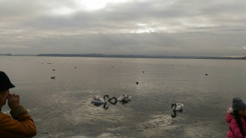 В Керчи на пляже по Сморжевского зимую лебеди, - передаёт Керчь.ФМ. Керчане семьями приходят кормить птиц.