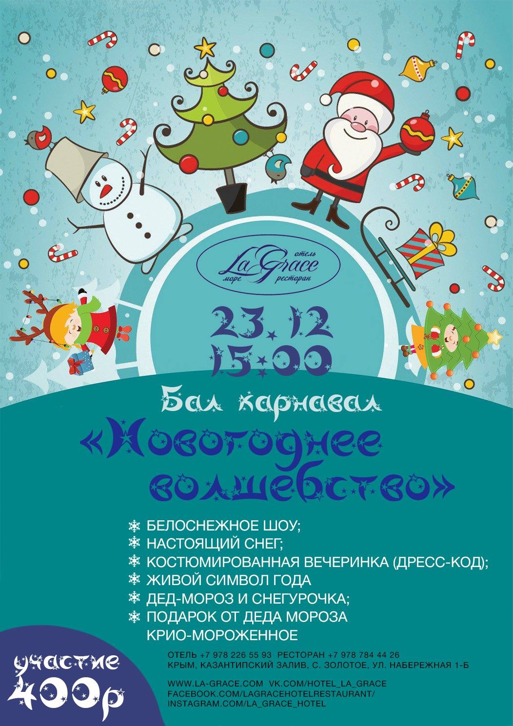 Мы вместе с нашими друзьями из детского игрового центра «Мультляндия» решили, что для сказки не может быть ограничений, а значит самое время для костюмированного бала карнавала «Новогоднее волшебство». В La Grace вас ждёт белоснежное шоу, настоящий снег, костюмированная вечеринка (дресс-код), живой символ года!