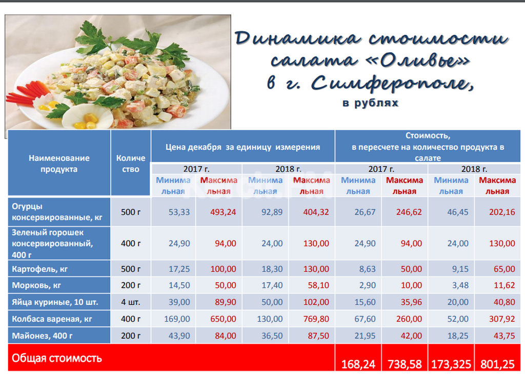 Вместе с тем, в течение 2018 года подорожали соленые, маринованные огурцы, хлеб для бутербродов, курица и яйцо куриное. Стоимость салата «Оливье» в декабре 2018 года составила 173, 33 руб., в декабре 2017 года - 168, 24 руб.