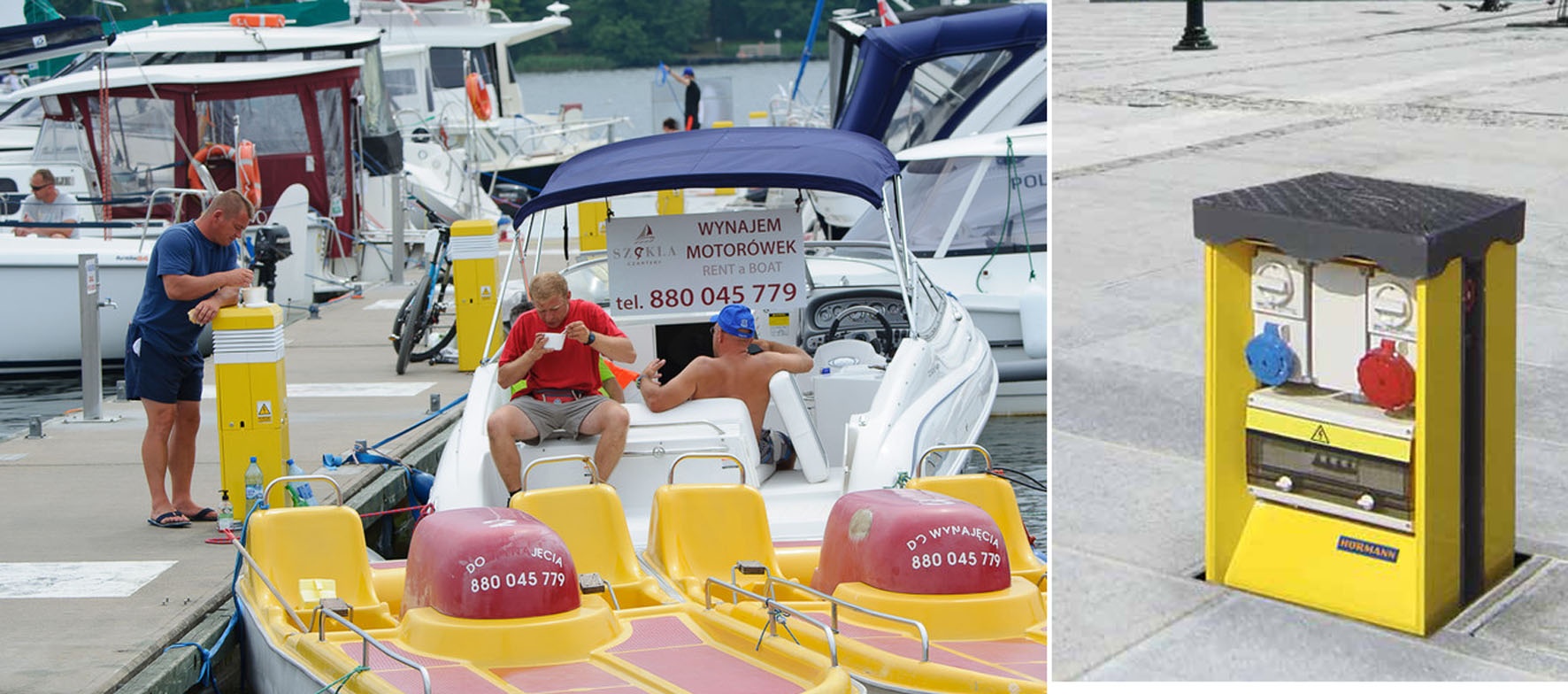 Станции энергоснабжения для подключения электричества, воды, сжатого воздуха и телефона. Широко применяются на специально оборудованных стоянках для яхт, катеров и других маломерных судов, на которой экипажам предоставляются различные услуги.