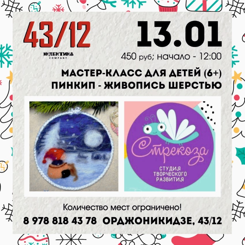 13-го января приглашаем ребят от 6-ти лет. Начало - 12:00. Стоимость участия - 450 руб (все материалы включены).